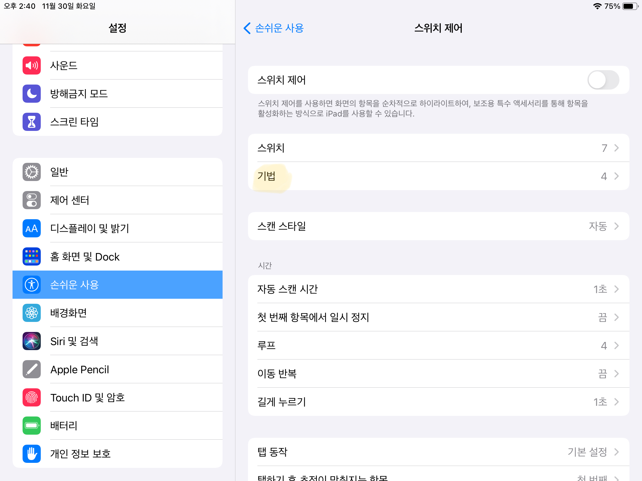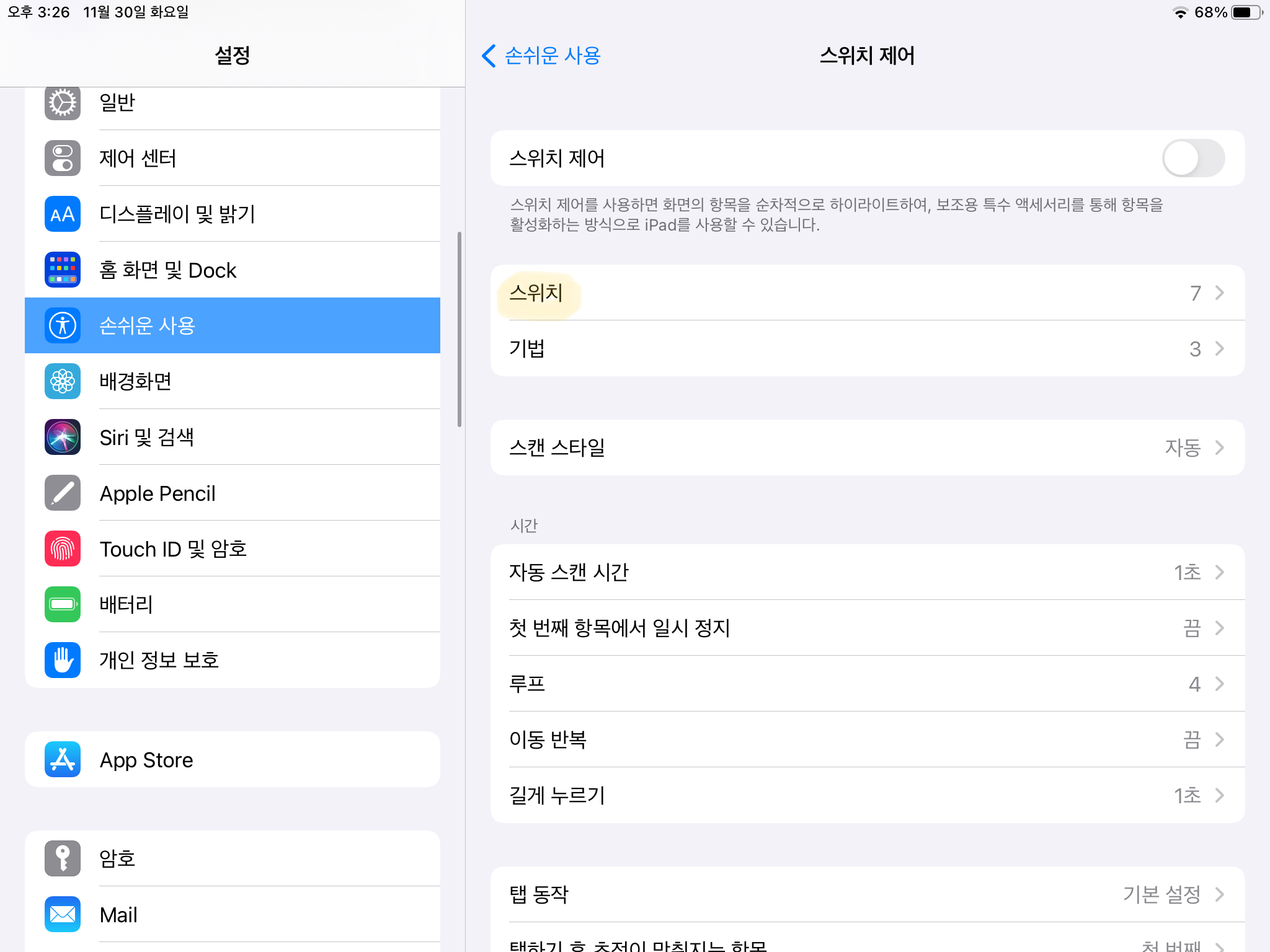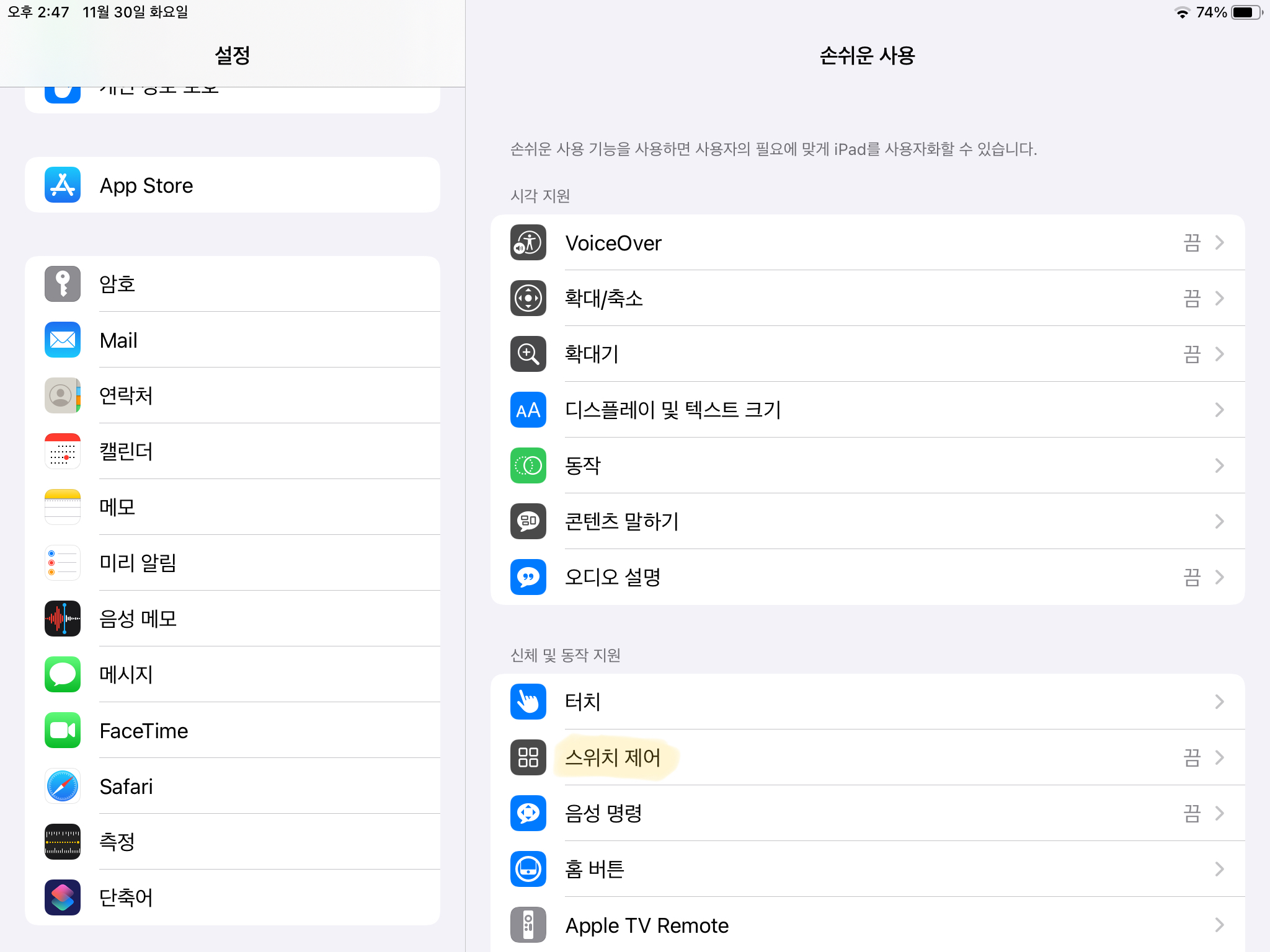 1. 설정 -> 손쉬운 사용 -> 스위치 제어를 눌러주세요.